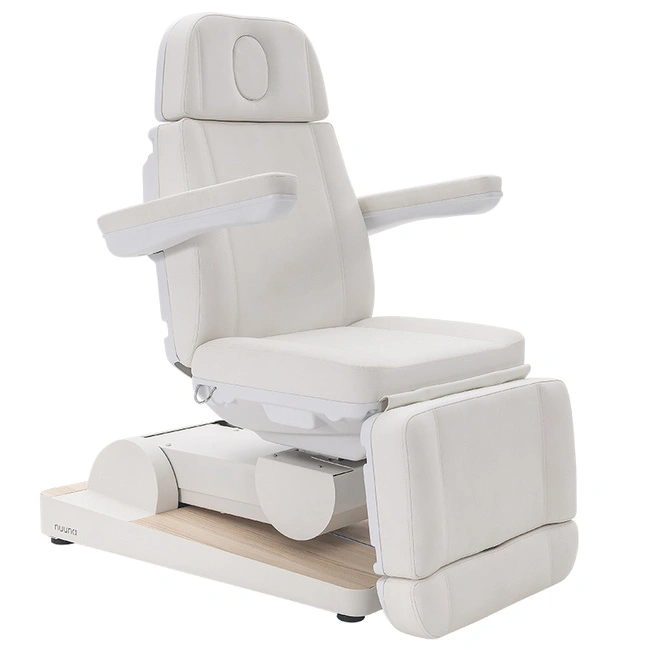 Solidna konstrukcja z metalu malowanego proszkowo, podstawa z wykończeniami z drewna, która jest dodatkowo podświetlana LED. Obłędnie wygodny materac, wykończony trwałą i łatwą w czyszczeniu tapicerką z materiału PU w kolorze białym. Czterosilnikowy system obsługi elektrycznej do płynnego sterowania wysokością, oparciem, podnóżkiem i pochyleniem siedziska, oraz pozycją Trendelenburga (ustawienie nóg powyżej poziomu głowy), która jest przydatna podczas wielu zabiegów.