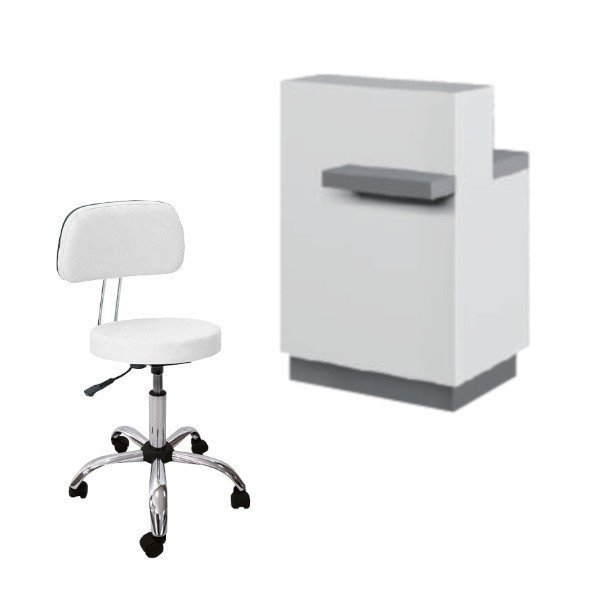 Profesjonalny zestaw mebli do recepcji kosmetycznej lub fryzjerskiej. Idealne połączenie wygodnego taboretu oraz estetycznej i niedużej recepcji wpasuje się w każde wnętrze. Delikatna stylistyka i idealnie pasujące wszędzie kolory. Zestaw idealny do każdego salonu usługowego. Piękna stylistyka o lekkim kształcie i prostej budowie!
