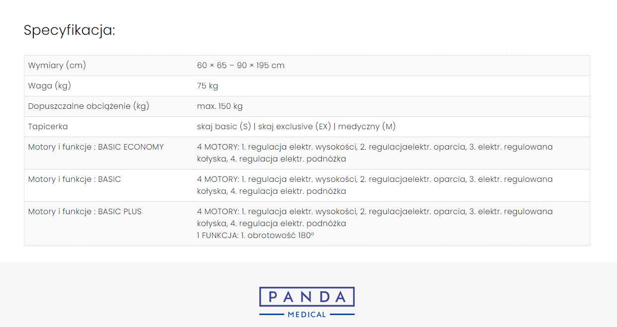 Fotel medyczny Sanmed Panda Medical posiada dodatkowe funkcje częściowego podgrzewania materaca oraz regulowanego podparcia odcinka lędźwiowego. Regulowany elektrycznie fotel medyczny z możliwością wyboru specjalistycznej tapicerki kosmetycznej lub gładkiego medycznego skaju. Spełnia restrykcyjne normy medyczne.