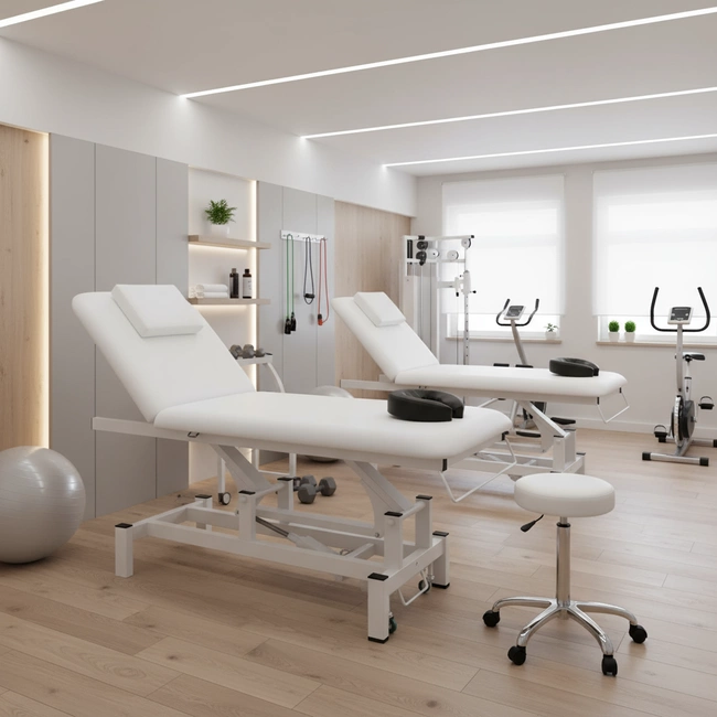 Leżanka kosmetyczna VITAL została wyposażana w 1 silnik sterujący wysokością, oparcie zaś regulowane jest manualnie za pomocą dźwigni gazowej. Łóżko kosmetyczne wyposażone zostało także w zagłówek z otworem odpowietrzającym, na którym znajduje się zdejmowana poduszka.