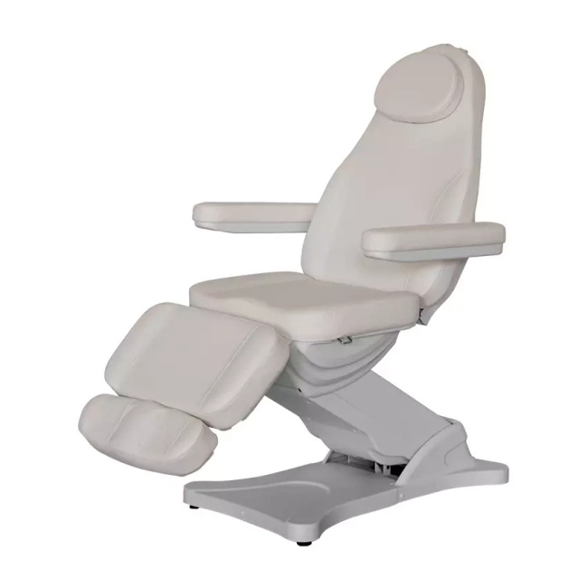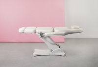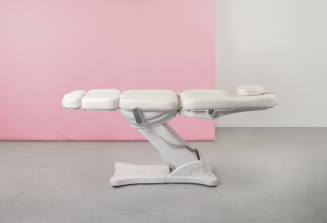 Mebel kosmetyczny został wyposażony w 3 silniki sterujące jego wysokością, nachyleniem oparcia oraz pochyleniem podnóżka. Fotel kosmetyczny sterowany jest elektrycznie za pomocą pilota ręcznego. Zagłówek jest bardzo wygodny, posiada zdejmowaną poduszkę, pod którą znajduje się otwór odpowietrzający. Podłokietniki w tym fotelu kosmetycznym są zdejmowane, dzięki czemu możesz korzystać także z fotela bez nich.