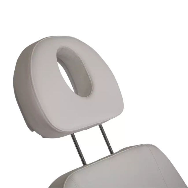regulują podnóżek. Podłokietniki w fotelu kosmetycznym są składane i regulowane, zagłówek posiada otwór odpowietrzający oraz zdejmowaną i wygodną poduszkę.
