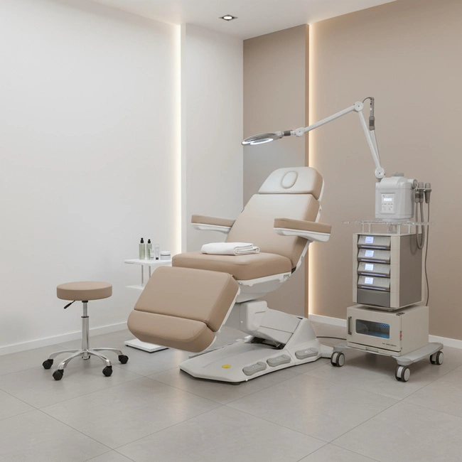 Solidna konstrukcja fotela kosmetycznego elektrycznego posiada wbudowane sterowanie nożne dla szybszej i bardziej komfortowej obsługi oraz podświetlenie LED w opcji MULTI KOLOR. Oprócz pilota ręcznego fotel może być także obsługiwany sterownikami, które zostały wbudowane w panele boczne fotela kosmetycznego. Całość wraz z ULTRA KOMFORTOWYM materacem tworzy piękną bryłę o minimalistycznym kształcie.