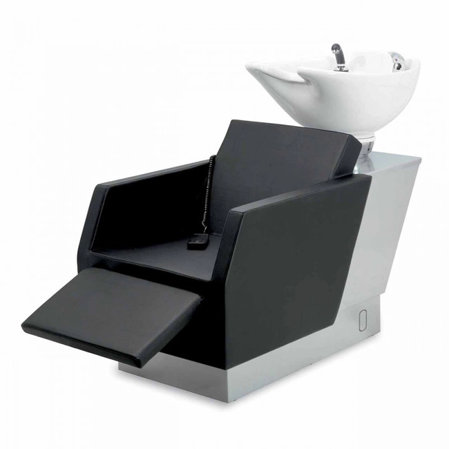Profesjonalna myjnia fryzjerska ARTECNO® EVOLO RELAX w kolorze czarnym z białą umywalką, jest dostępna w wersji standardowej i relaksacyjnej z praktycznym, elektrycznym podnóżkiem, zapewniającym klientom maksymalny komfort. Baza myjni fryzjerskiej została wykonana z trwałej metalowej konstrukcji, natomiast siedzisko jako jedne z niewielu posiada wypełnienie w postaci pianki MEMORY. Całość została obita trwałym skajem z powłoką odporną na zużycie w dowolnie wybranym przez Ciebie kolorze z palety barw producenta. Wszystko tworzy nie tylko piękny, ale bardzo wygodny mebel fryzjerski.